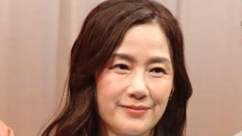 <原田知世>首元リボンのふんわりトップス 大人可愛い水色コーデ、足元はピンクパンプス